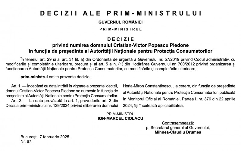 Cristian Popescu Piedone, fostul primar al Sectorului 5, a fost numit șeful Autorității Naționale pentru Protecția Consumatorilor, informează Digi24. Cristian Popescu Piedone, fost primar al Sectorului 5, a fost numit la conducerea ANPC, în locul lui Horia Constantinescu. Decizia semnată de premierul Marcel Ciolacu a fost publicată vineri în Monitorul Oficial. Sursă: Monitorul Oficial Piedone a fost condamnat la închisoare în dosarul Colectiv, însă sentința sa a fost anulată de Înalta Curte de Casație și Justiție, iar el, eliberat. Cristian Popescu Piedone a candidat din partea PSD pe listele pentru Senat, la Giurgiu, însă a pierdut mandatul la redistribuire, în Parlament intrând candidatul POT. Fostul preşedinte al Autorităţii Naţionale pentru Protecţia Consumatorilor, Horia Constantinescu, a renunţat la funcţie după ce a devenit candidatul PSD la Primăria Constanţa, la alegerile locale din luna iunie.